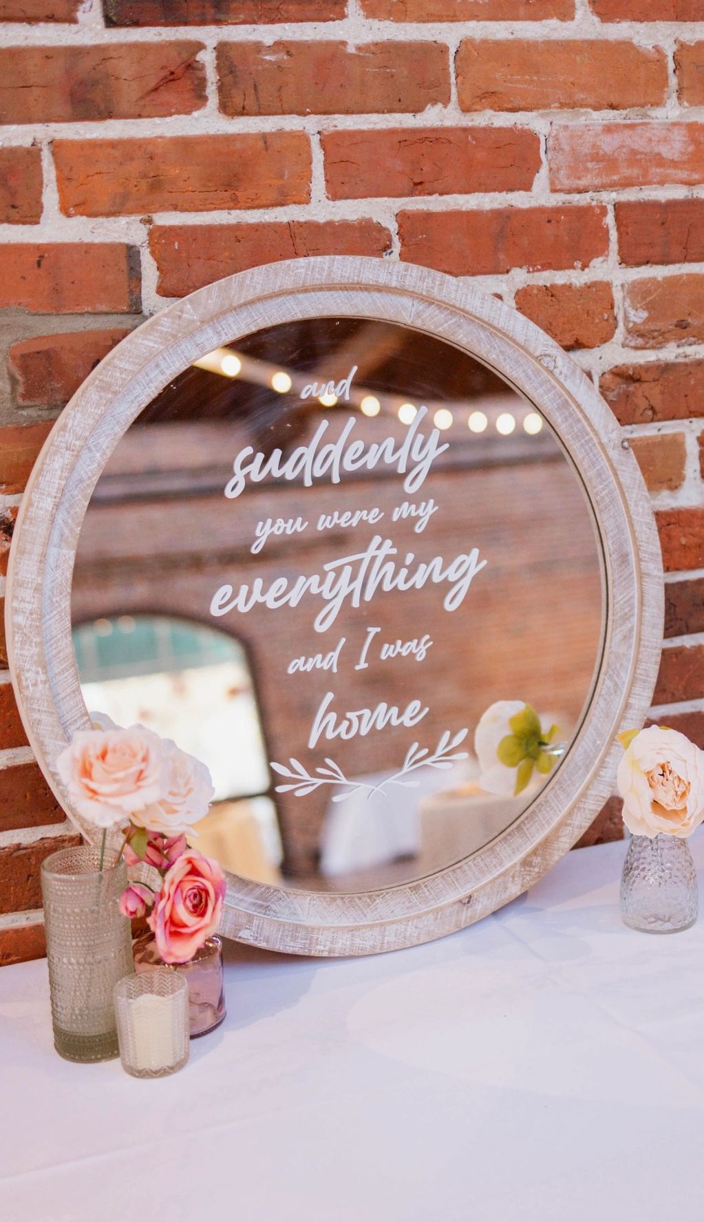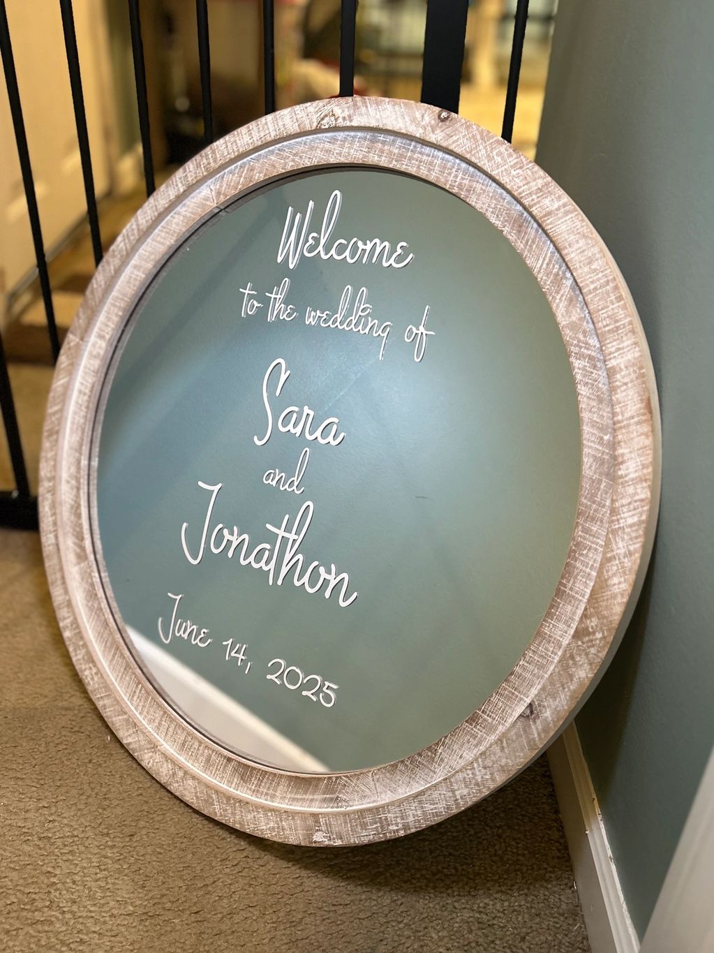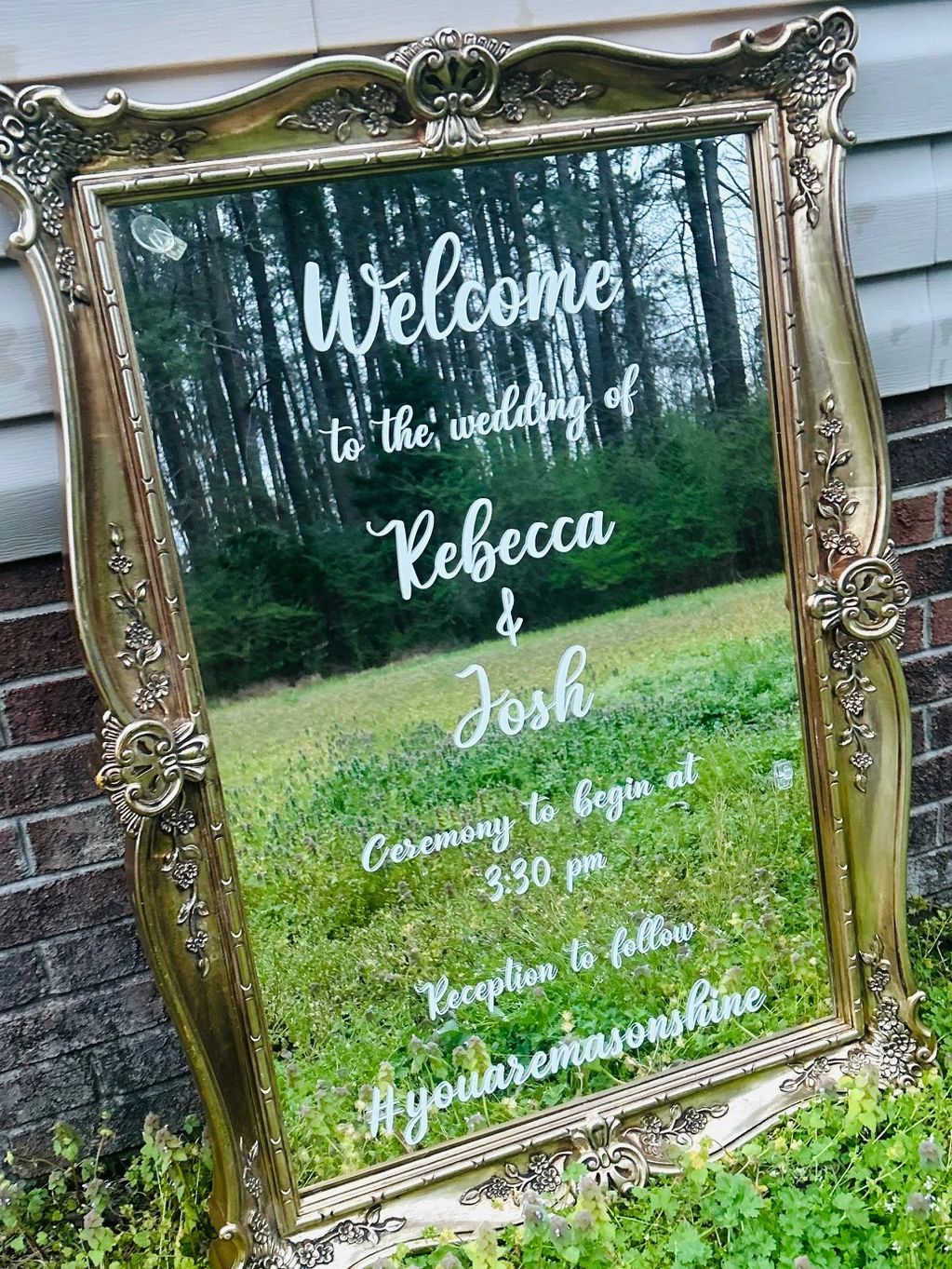 Completely customizable with vinyl lettering to fit any need. Most commonly used as a Welcome sign. Pictured with hooks to hang florals on mirror (optional).